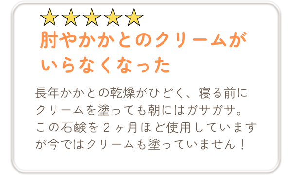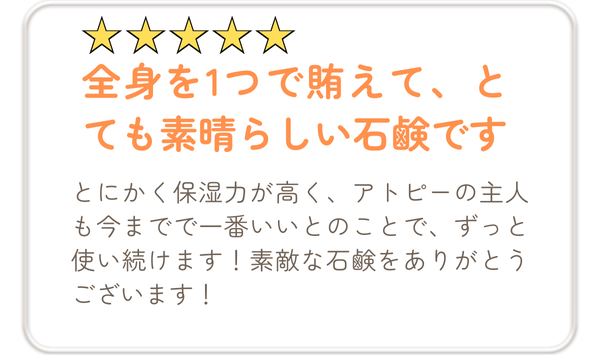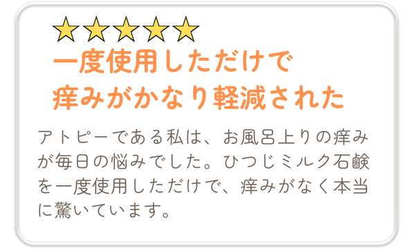 孫がアトピーで、今までアトピーに良いという石鹸や、自然由来と書いてある石鹸を使ってきましたが、痒みはなくなりませんでした。こちらの石鹸を使ったら痒くないみたいで驚いています。